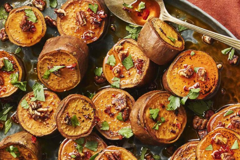 The sweet potato medallions develop caramelized edges as they roast, but the real magic happens as they soak up a spicy maple sauce as they finish cooking. The potatoes transform — becoming velvety soft and creamy and infused with earthy sweetness. For even browning, don’t overcrowd the pan — give every potato slice room to roast (crowding will generate steam and inhibit the surfaces from caramelizing). The melted potatoes are sprinkled with candied pecans for a nutty, crunchy finish.