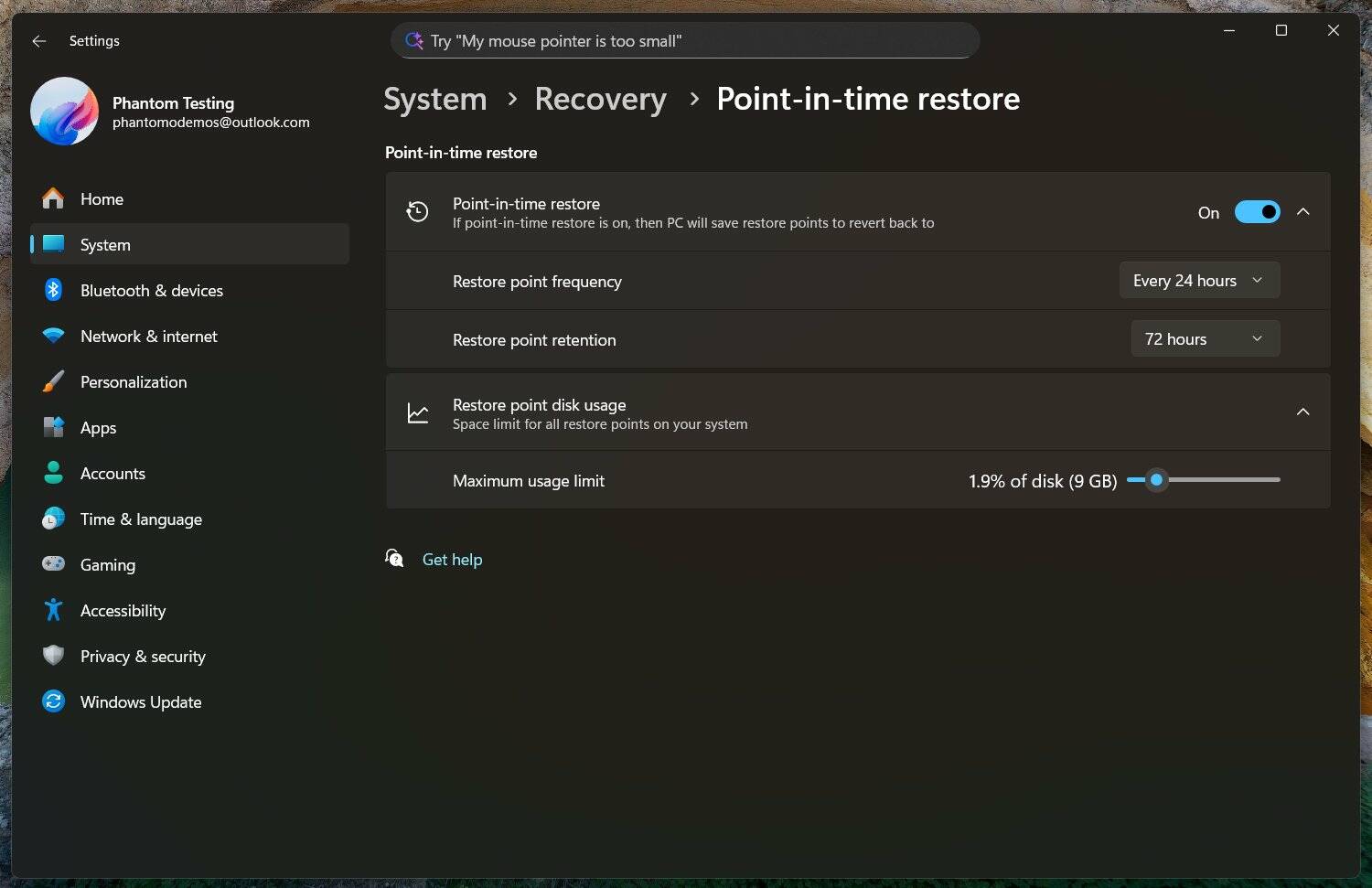 Windows detective Phantomofearth managed to get a sneak peek at the Settings page for Point-in-time restore and posted a look at a “pre-preview” of the feature. As the image below shows, the feature allows you to set the frequency of the snapshots it takes and how long it retains those snapshots. You can have a frequency of every 4, 6, 12, 16 or 24 hours and a retention period of 6, 12, 16, 24, or 72 hours.