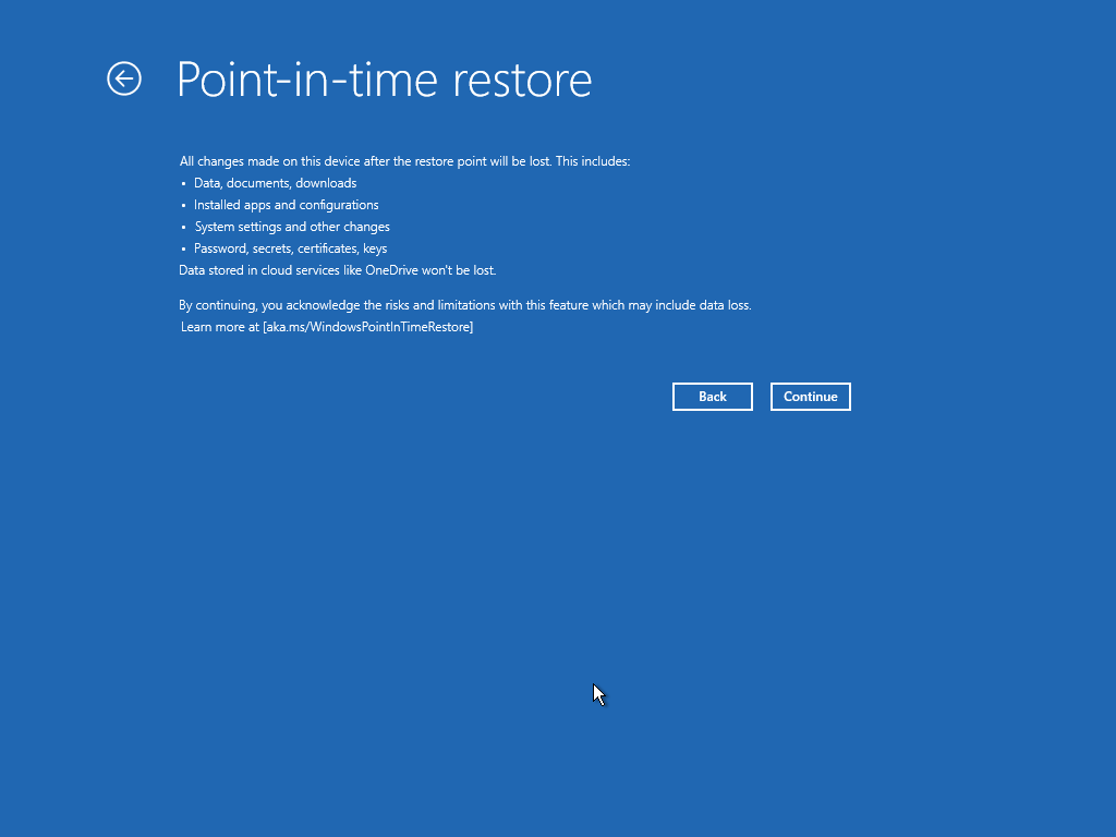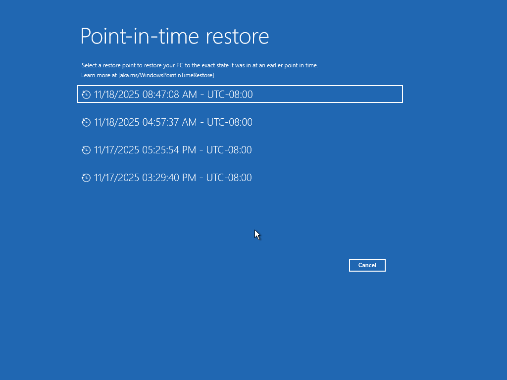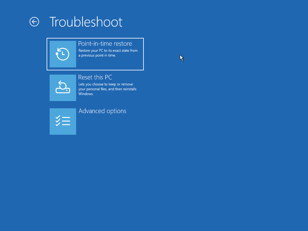Phantomofearth told The Register that Point-in-time restore is available from the Windows Recovery Environment (WinRE) that is available when users enter Advanced Startup, boot to recovery media, or hold down Shift while selecting restart from the login screen. Once you reach WinRE, you select Troubleshoot and Point-in-time restore is an option.