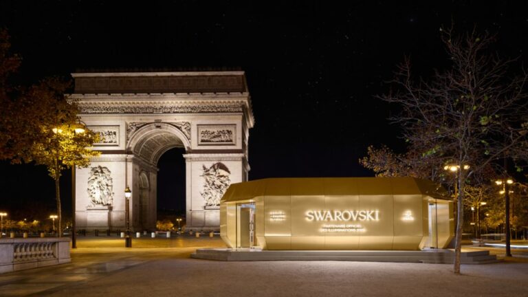 Built from modular containers designed for reuse, the structure nods to Swarovski’s sustainability commitments. The project was developed with the Comité Champs-Élysées over nearly a year.