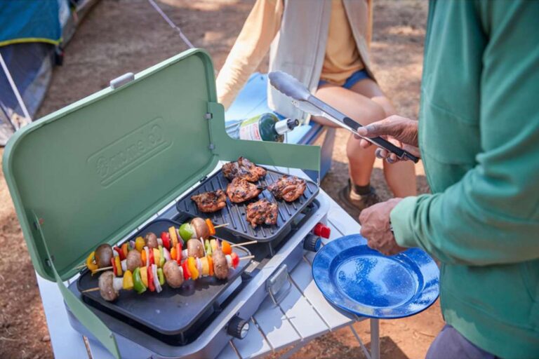 A camp stove is the easiest way to cook hot meals in the great outdoors. This propane-fueled portable stove from Coleman has two burners and comes with a grill and griddle attachment for grilling burgers or cooking flapjacks. At the end of your adventure, the grill folds up and has a built-in handle for easy carrying.